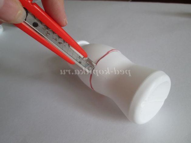 Намітьте маркером приблизно середину баночки, розріжте канцелярським ножем. Якщо лінія розрізу виконана не дуже рівно, можна підрівняти ножицями. Якщо ви робите виріб разом із дітьми, якого б віку вони не були, користуйтеся ножем самі. Я роздаю своїм учням вже готові підставочки для прикраси.