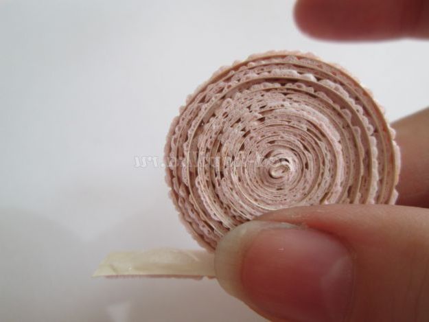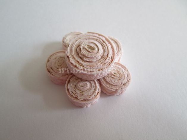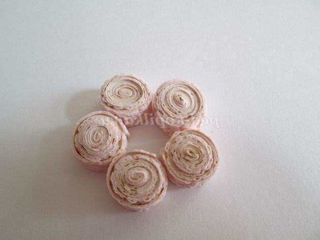 Розріжте цілу смужку навпіл. Скрутіть гурток. Нам необхідно виконати таким чином 5 гуртків. Склейте їх у формі квіточки.