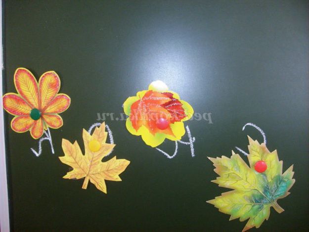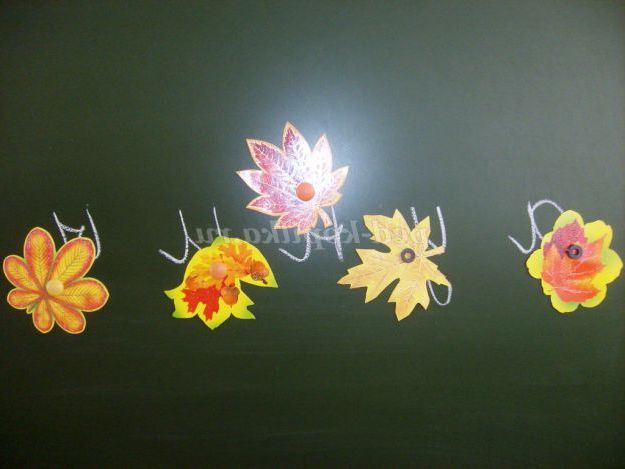 (На дошці написані літери «а, в, н, і, и». Частина кожної букви прикриті осінніми листочками)