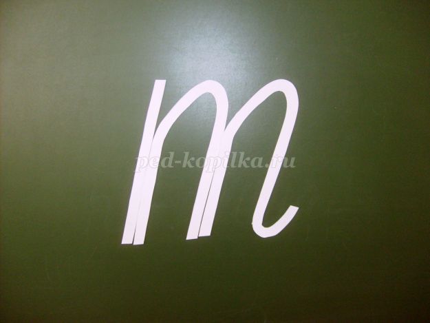 - Зверніть увагу, що лінія нахилена вправо сильніше. Вгорі заокруглюємо, торкаючись верхньої лінії, потім нахил з закругленням внизу, торкаючись нижньої лінії.