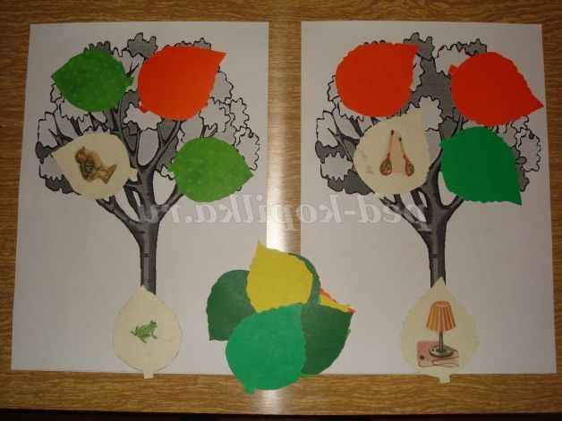 Хід гри: На парту викладаються дві чорно-білі (можна кольорові) картинки дерев, між ними лежать листочки картинками вниз, біля основи стовбура кожного дерева кладеться картинка, назва якої починається на звук «л» і на звук «ль».