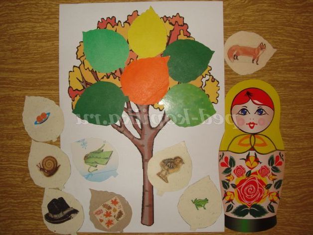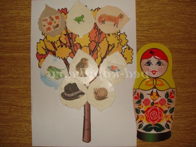 Обладнання: картинка із зображенням осіннього дерева, картинка матрьошки Лени, різнокольорові листочки, на звороті яких наклеєні різні картинки.