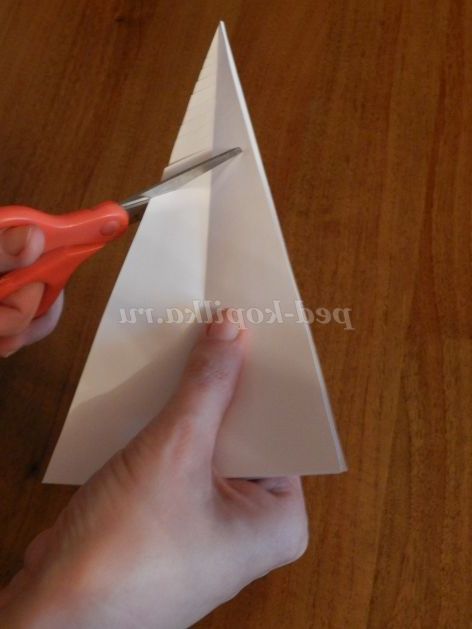 6.Каждое ребро ялинки акуратно надрізаємо паралельними лініями. При виконанні вироби молодшими школярами спочатку олівцем наноситься розмітка.