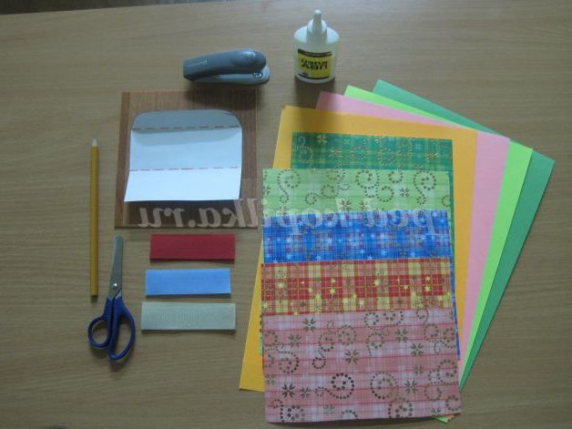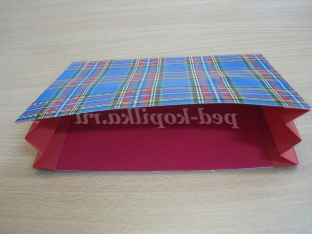Тепер виготовимо сумочку. Аркуш кольорового картону розміру А4 скласти навпіл. Щоб сумочка виглядала більш естетично, я заздалегідь на зворотну сторону різнобарвного картону приклеїла кольоровий папір. Так сумочка буде красивою і всередині.