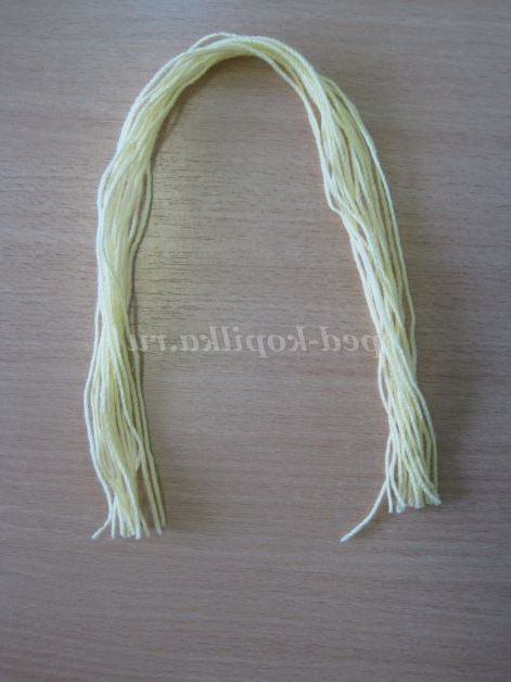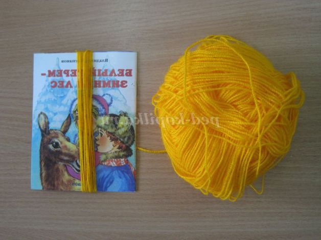 Я буду чергувати кіски: жовті - довгі, помаранчеві - короткі. Щоб кіски були однаковими по довжині, тепер я візьму книгу меншого розміру і намотаю на неї декілька шарів пряжі.