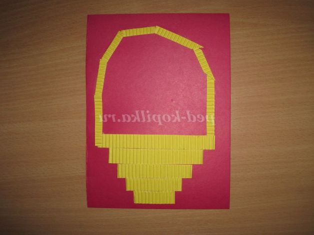 7. Щоб зобразити ручку кошика, потрібно вирізати довгу смужку з гофрованого картону, приклеїти її у формі дуги.