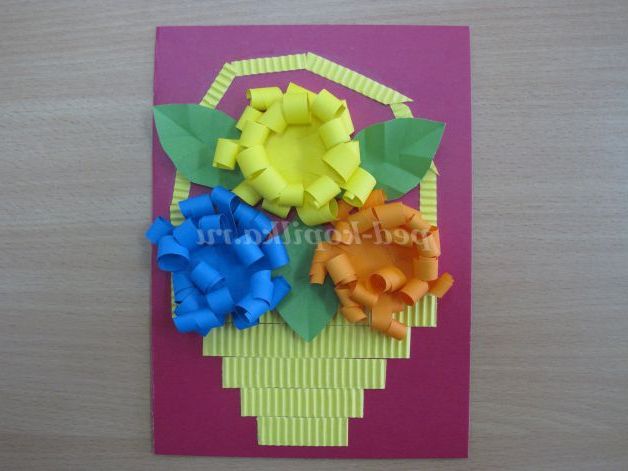 Опис. Наближається перше весняне свято - 8 Березня. Хочеться порадувати цікавими виробами наших матусь. Пропоную Вашій увазі майстер - клас із виготовлення вітальної листівки «Кошик з квітами». Думаю, що такий подарунок припаде до душі кожній жінці.