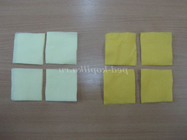 Приступимо до декорування. Виготовимо квітки мімози з жовтих паперових серветок. Добре, якщо Ви зможете підібрати кілька жовтих відтінків серветок. Розріжте серветку на 4 частини.