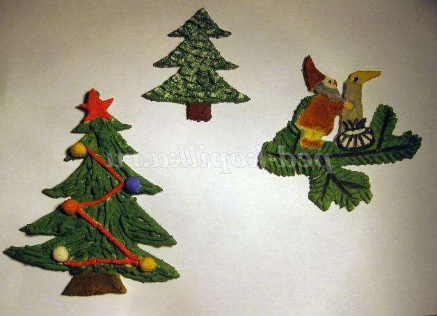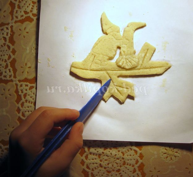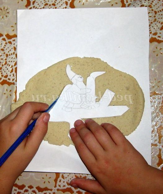 Різноманітні новорічні сюжети для художньої ліпки можна придумати самим, знайти в дитячих книжках чи на поштових листівках. Тісто розгортаємо у вигляді пласта товщиною 1 сантиметр. Для точного вирізання з пласта деталей композиції застосовуємо заздалегідь заготовлені шаблони цих деталей
