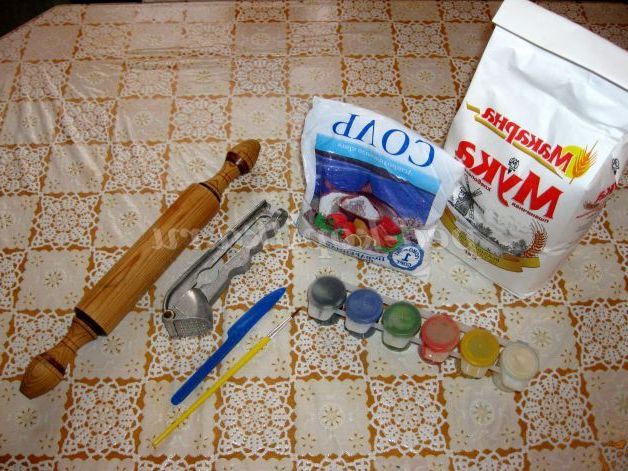 Основний матеріал для виготовлення виробів з солоного тіста: борошно вищого гатунку - пшеничне, житнє (надає тісту більше пухкості), сіль «Екстра». Звичайна пропорція для замісу солоного тіста: на 2 частини борошна, треба взяти 1 частина солі і розвести водою до консистенції м'якого пластиліну. Готове тісто повинне вийти еластичним. Тісто будемо зберігати в поліетиленовому пакеті, щоб воно не пересохло.