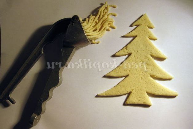 Якщо тісто пропустити через чеснокодавку, то вийдуть кучерики у формі спагетті, з допомогою яких можна зробити крону дерева. Місце з'єднання деталей між собою змочуємо водою