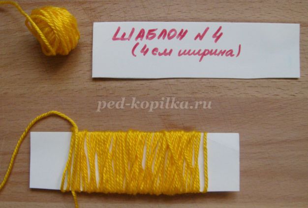 - Беремо клубок з жовтою пряжею і шаблон №4, навиваем на нього нитку. Нитка не повинна бути натягнута і деформувати шаблон, вона вільно огинає його краю!