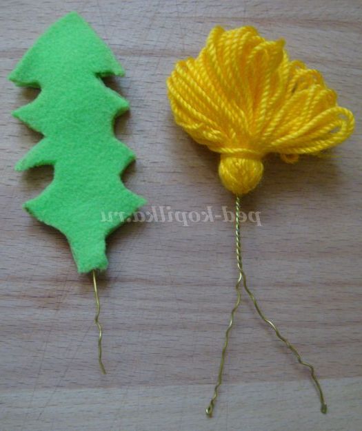 Матеріали для роботи: модель кульбаби, картонний шаблон для навивания нитки з необхідним набором пряжі, м'яка дріт для стебел і листя, листя з флісу.