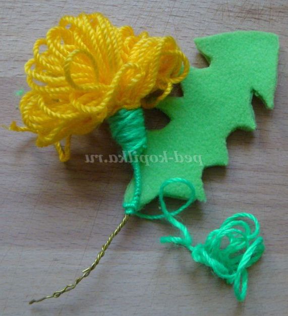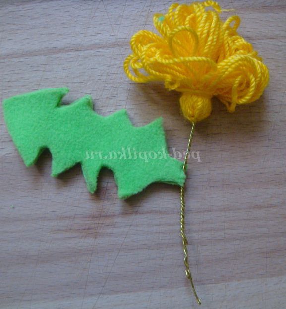 Приступимо до виготовлення квітів, нам знадобляться жовта і зелена пряжа, м'яка дріт, і листочки з м'якої тканини або зеленого картону.