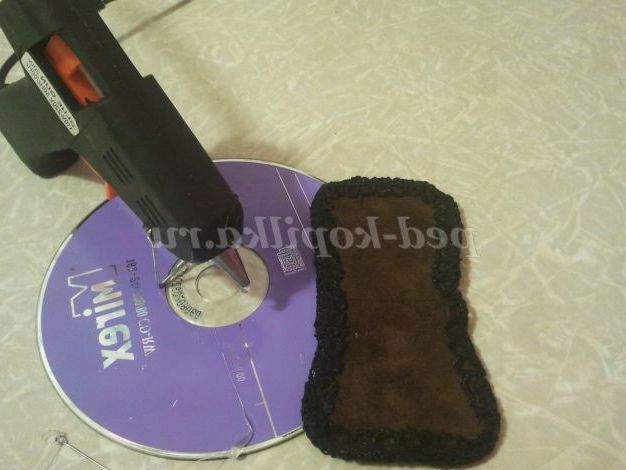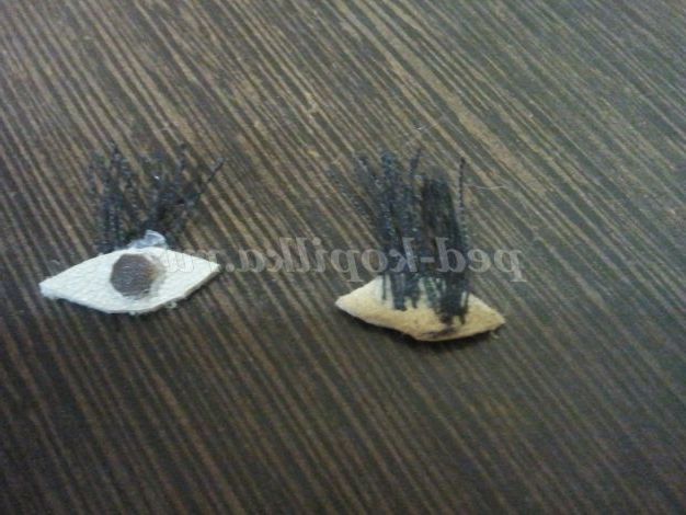 22. Зі шматочків шкіри вирізаємо оченята і за допомогою клею приєднуємо зіниця до очниці і також приклеюємо вії зі звичайних швейних ниток.
