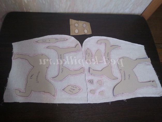 1. Розкласти лекала на тканині так, щоб не було перелицьованих деталей, зробити припуски на шви 0.5-0.7см, вирізати.