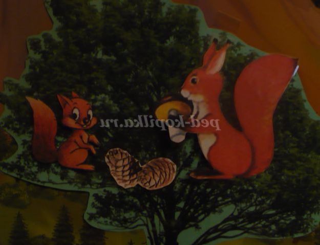 Вихователь: Молодці. Женя, дивись, у нашої білочки вже є гриб, знайди в коробочці, що - небудь ще для білочки і почастуй її.