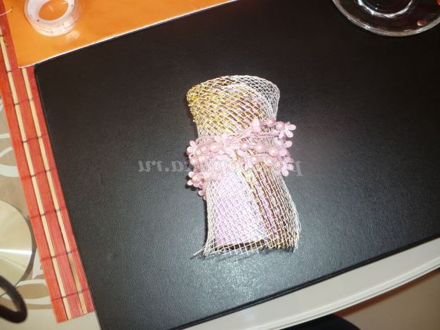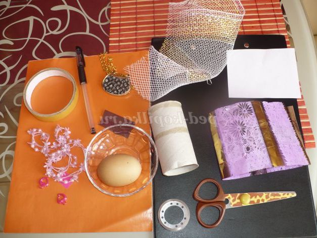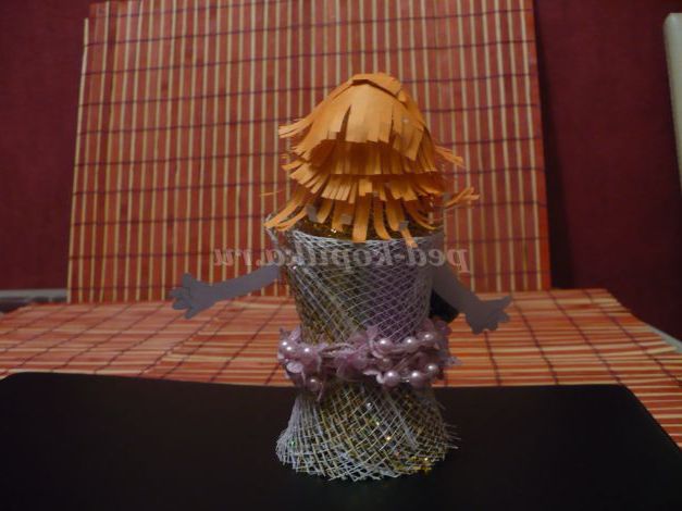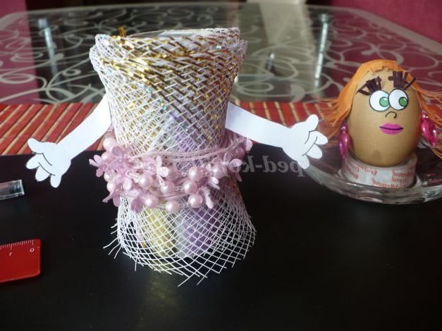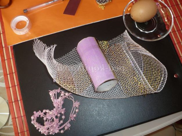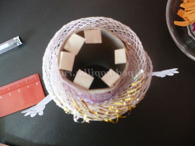 1. Картонну трубку від туалетного паперу обклеїли кольоровим папером і зверху обернули сіткою для декорації кольорів, затягли в області пояса ниткою з нанизаними намистинами і бісером, або, як у нашому випадку, декоративної гумкою. Яку вже не використовуємо.