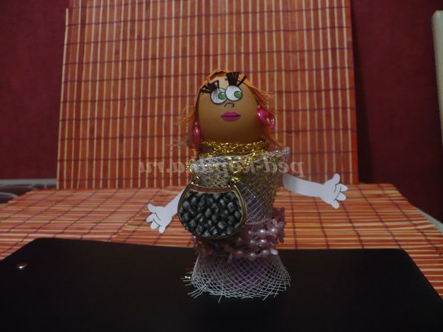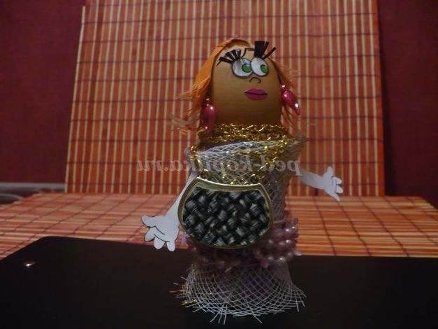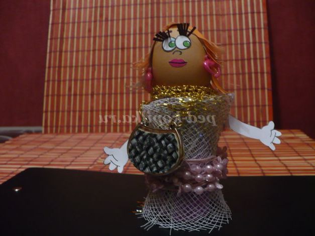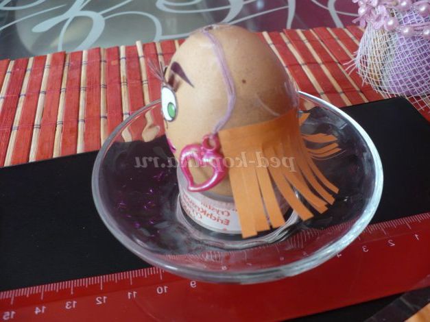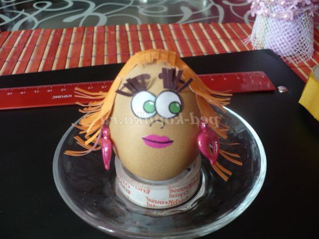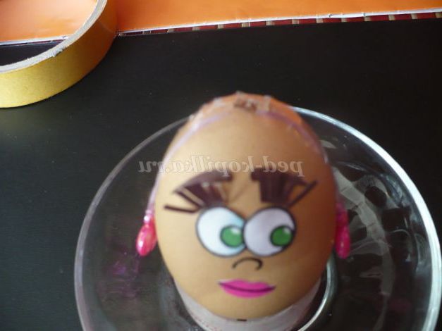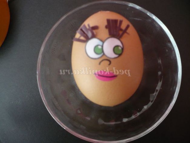 2. Робимо особа: Всі деталі приклеюємо на двосторонній скотч. Малюємо на папері очі, вирізаємо і приклеюємо на яйце. Вирізаємо з коричневою кольорового паперу вії і брови, приклеюємо над очима. Під очима малюємо ніс чорною гелевою ручкою. З рожевої кольорового паперу вирізаємо губки, приклеюємо на яйце.