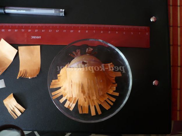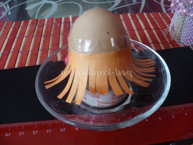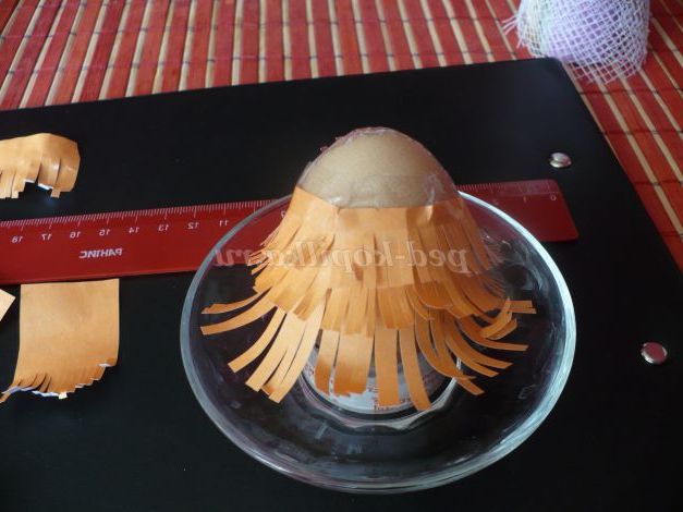 На яйце вкруговую клеїмо три довгі смуги на прозорий скотч, решта на двосторонній, таким чином, щоб його не було видно. Смуги наклеюються таким чином: спочатку смужку 9 см * 3,5 див.