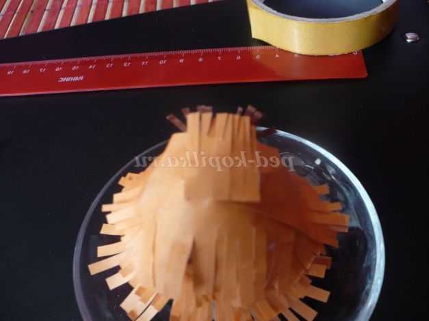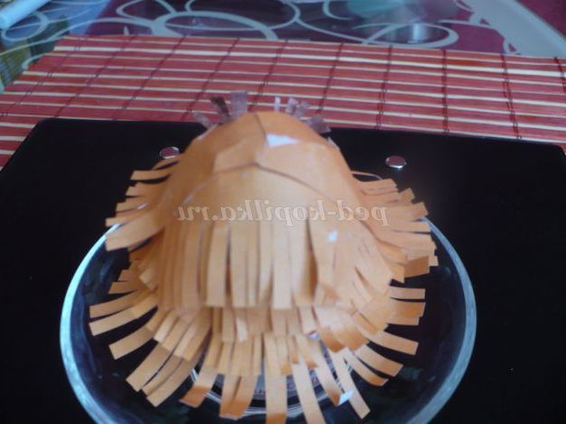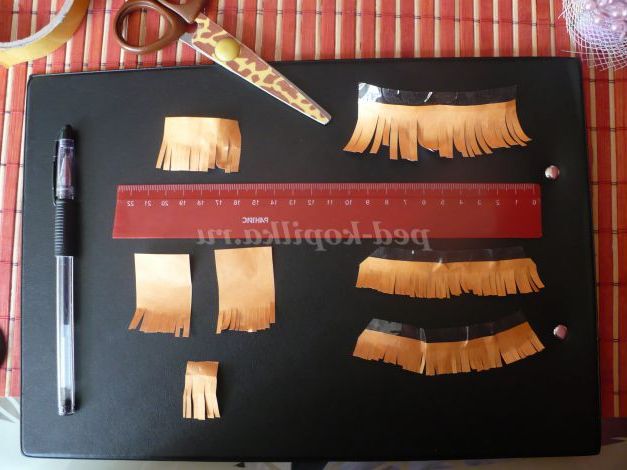 4. Робимо волосся: З жовтого кольорового паперу вирізали 3 довгих смуги різної ширини: 9см * 3,5см; 9,5см * 2см; 10 см * 1,8 см, і 4 коротких смуги: 4,5 см * 3см; дві однакових смуги 5см * 4см; і смужку на чубок 3,5 см * 2 см . Всі смуги, крім двох однакових смуг розміром 5см * 4 см, нарізали тонкими смужками, але не до кінця, а на 2/3 ширини. Дві однакових смуги розміром 5 см * 4см нарізаємо тонкими смужками на 1/3 ширини. Всі смуги трохи підкрутили на гелеву ручку.