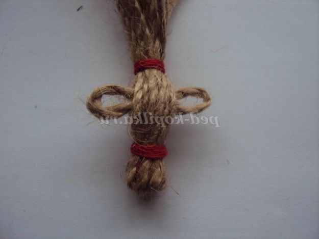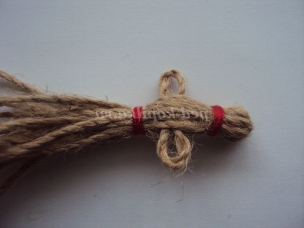 2. Взяти смужки шпагату за 27см. у довжину (8 шт), зав'язати на середині червоною ниткою «ірис».
