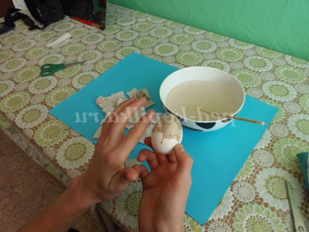 2. Приготувати клей, нарізати або нарвати туалетний папір. Обклеїти яйце (10 шарів). Дати висохнути 1 добу