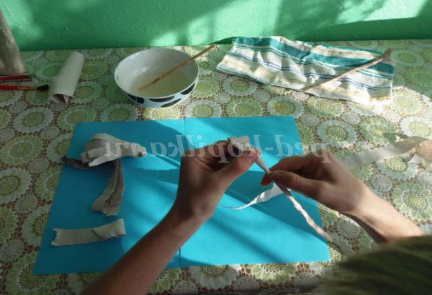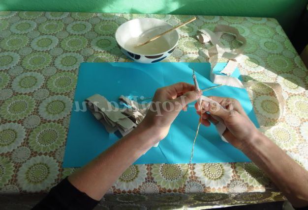 5. Нарізати стрічки з туалетного паперу, ширина стрічки 1.5 див. Обмотати дріт стрічкою, рясно змастити клеєм. Дати висохнути одну добу
