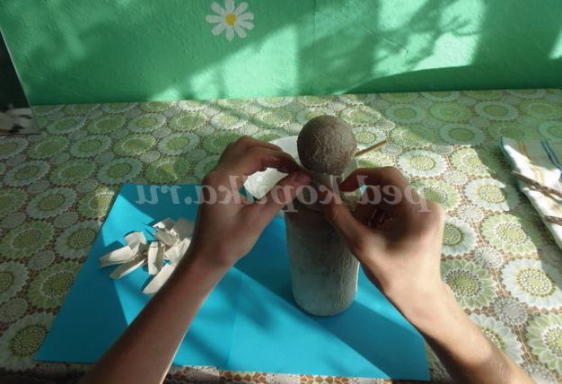 6. Яйце (голову) накласти на шийку пляшки і зафіксувати смужками з туалетного паперу, змащуючи їх клеєм і так 1 шар. Дати висохнути 1 добу