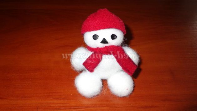 5. Приклеїмо шапочку на голові клеєм «Момент», наносячи клей в декількох місцях маленькими точками, на шию сніговика повяжем шарфик з кольорової тканини (фото 8)