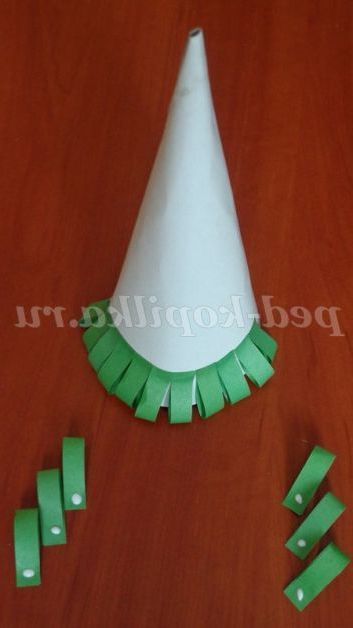 6. Знизу по краю конуса приклейте клеєм ПВА по одній заготовці-голочці, нижній край голочки повинен бути при приклеюванні на одному рівні з нижнім краєм конуса. Лінія приклеювання повинна бути рівною.