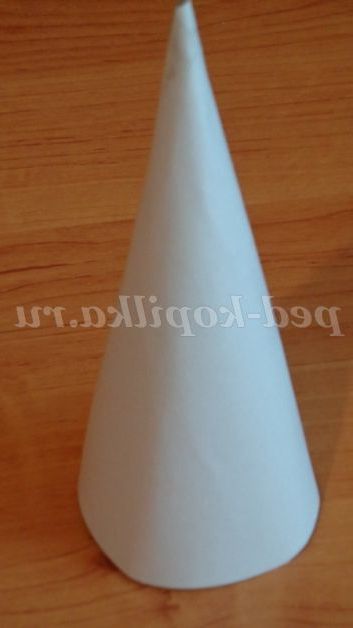 1. З аркуша білого картону прямокутної форми згорнути конус кулечком по спіралі, внизу шов прихопити степлером