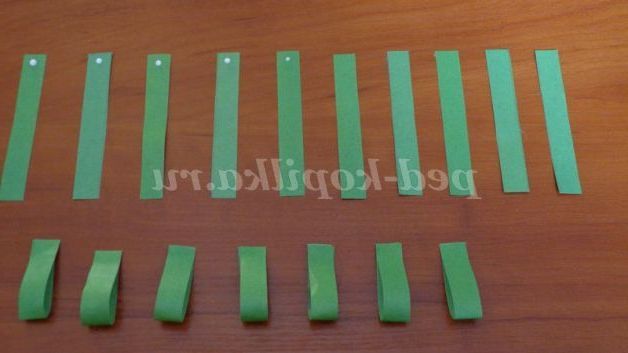 5. Нарізати смужки. Склеїти клеєм ПВА обидва краї кожної смужки вгорі, але не перегинаючи їх у лінії згину.