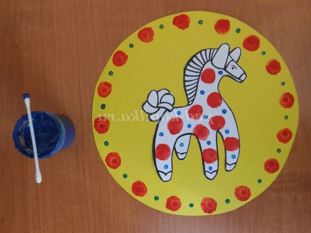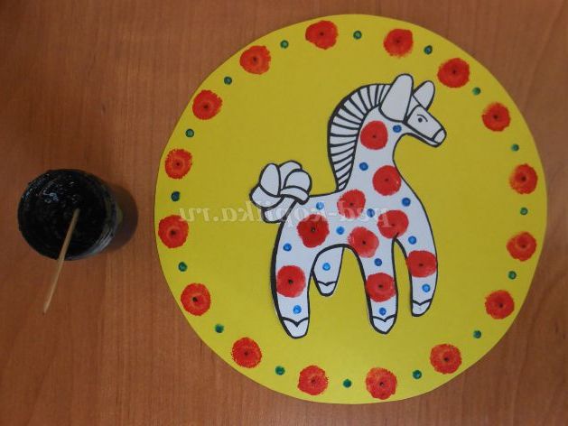 А тепер приступимо до прикраси тарілочки дымковскими візерунками. Спочатку поролоновим стусаном нанесемо по всій фігурки коня великі кружочки.Цвет можна вибрати будь-який з яскравою дымковской палітри, у мене це червоний.