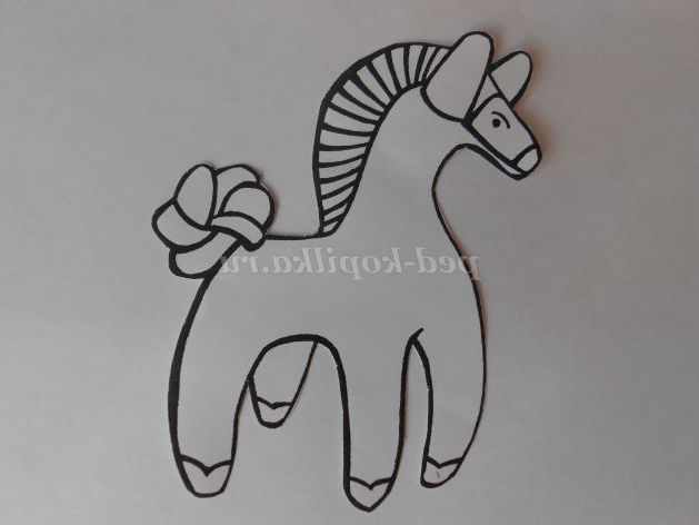 Акуратно тонким пензликом розфарбуємо хвіст і вушка нашого коня, чорною фарбою розфарбуємо копита.
