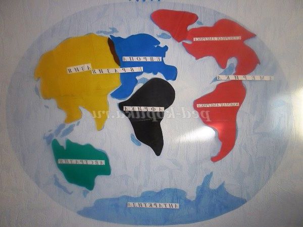 Вихователь пропонує розглянути обриси материків, пригадати назви, уточнити колір і дати пояснення