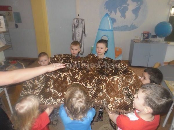 Вихователь: Ось ми і в космосі. Хлопці, здається, ми опинилися в невагомості. Як ви думаєте, чому немає невагомості на Землі? Так, тому що Земля притягує як магніт, не дарма кажуть: «Земне тяжіння»