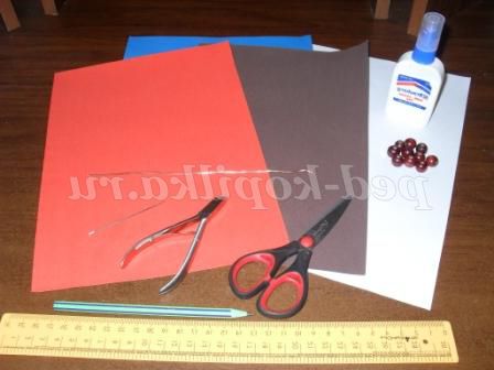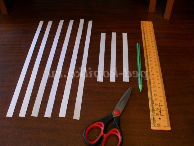 Нарізаємо з білої офісного паперу 6 смуг (довжиною 23 см і шириною 1 см ) і 3 смужки (завдовжки 16 см і шириною 1 см). Все у нас вийшло 9 смуг.
