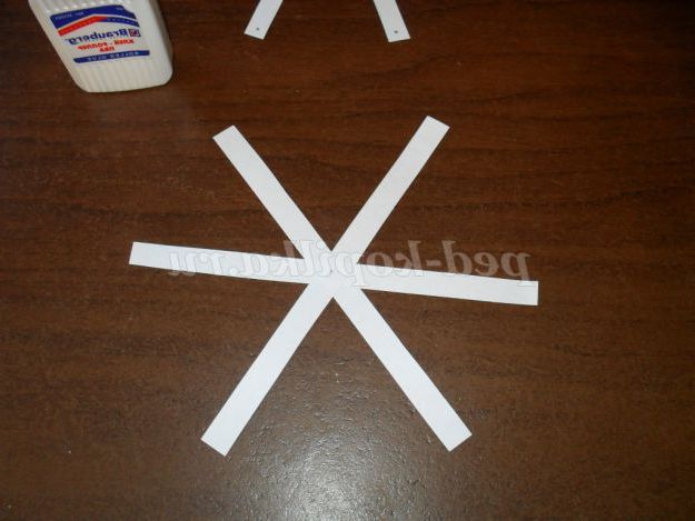Далі починаємо склеювати довгі смужки, з'єднуючи їх центри. Перші дві під кутом 90 градусів.