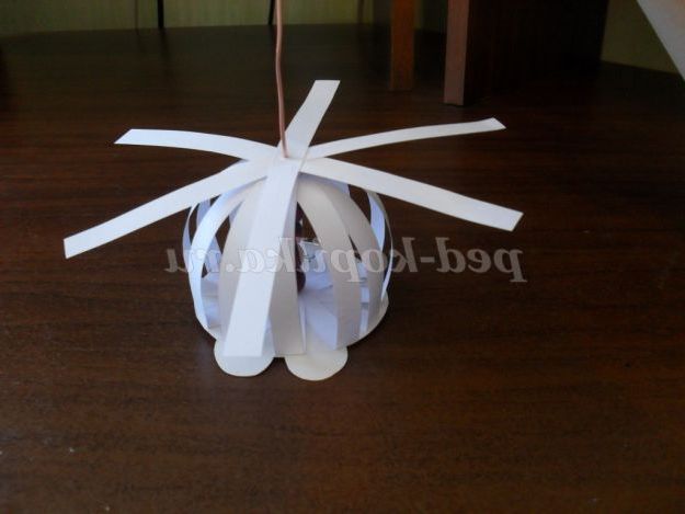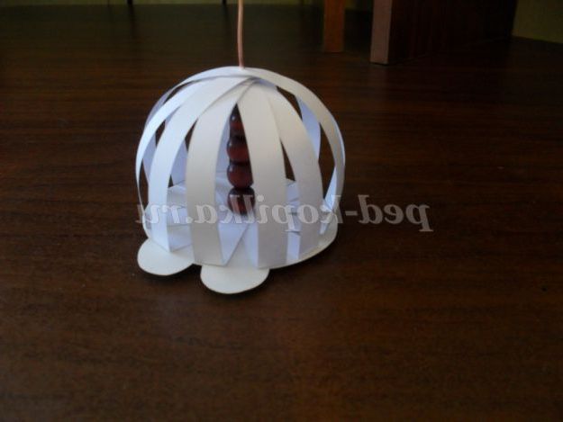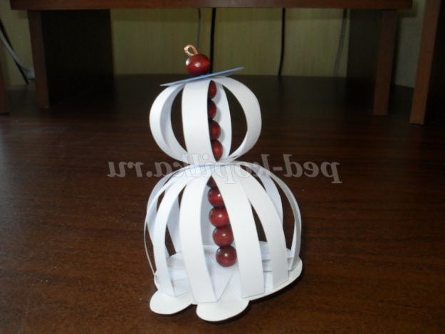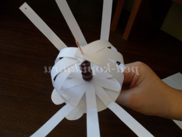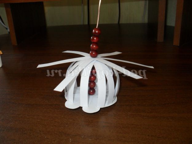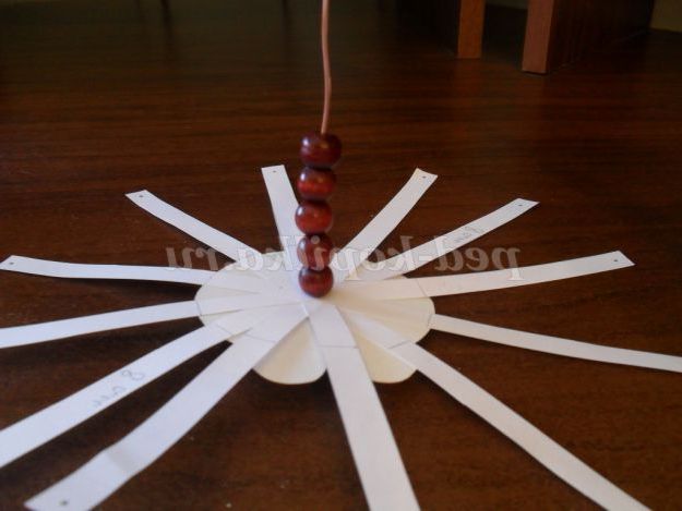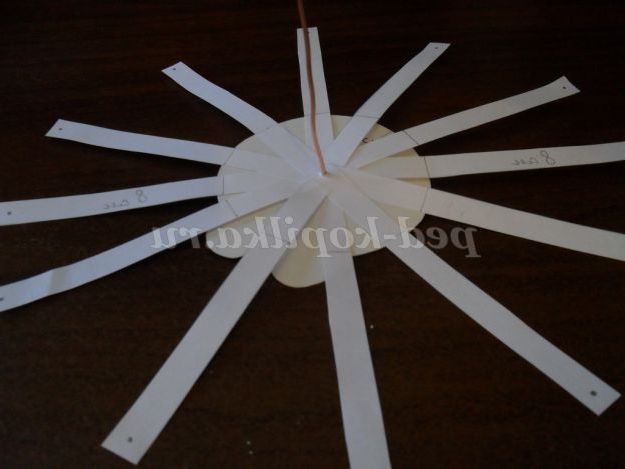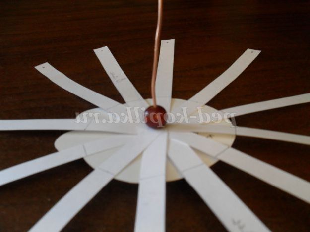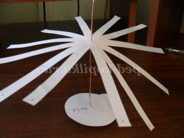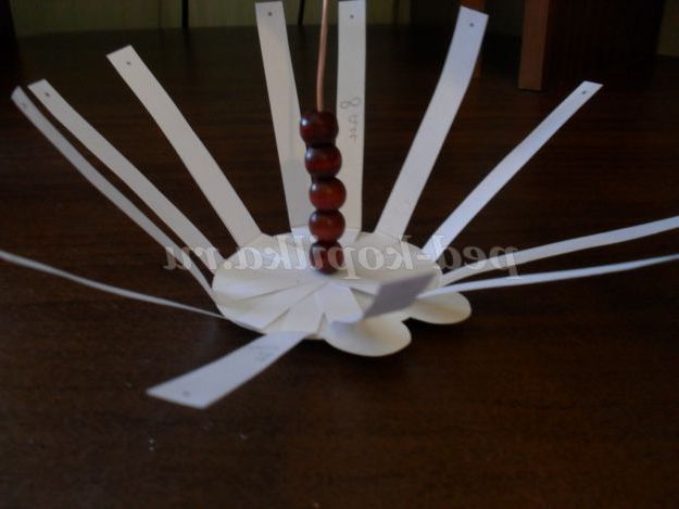 Беремо деталь з склеєних довгих смуг паперу і проробляємо в центрі отвір. Протягуємо її на дріт поверх підставки.