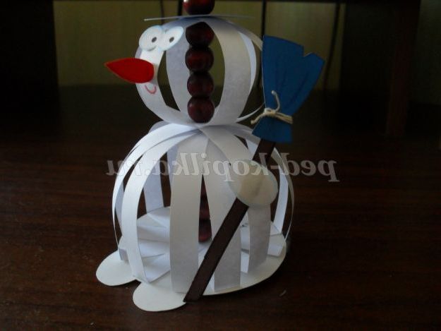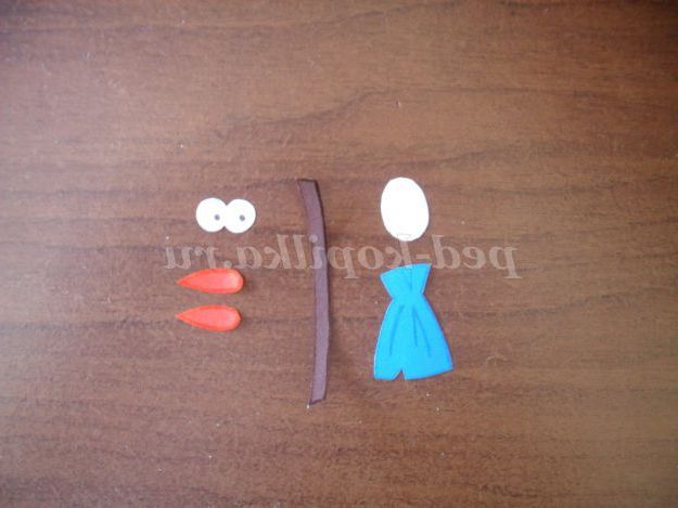 З помаранчевої паперу вирізаємо носик у вигляді морквини-2 елемента. З білого паперу оченята і 2 ручки у вигляді овалів. З блакитного паперу мітла, а з коричневої держак для мітли.