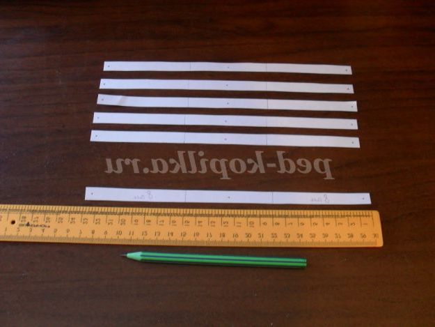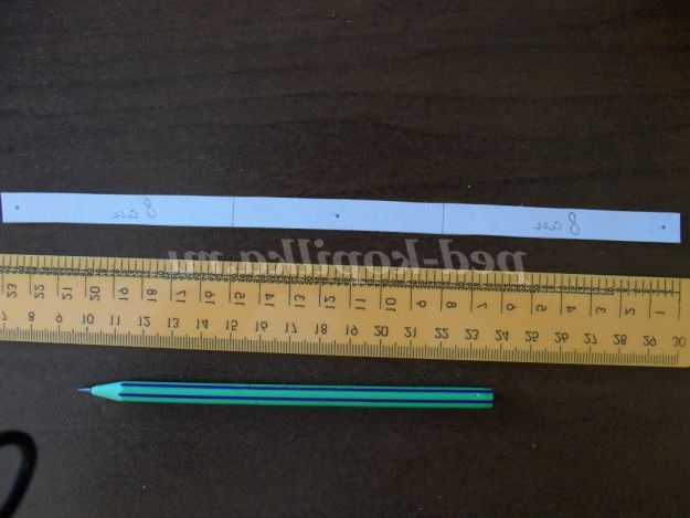 Беремо смужку довжиною 23 см і відміряємо з обох сторін по 8 см, проводимо вертикальну лінію. Це буде лінія згину. Далі знаходимо середину смужки (11,5 см) і ставимо в середині точку. По краях на відстані 0,5см теж ставимо крапки. Повторюємо ці дії з кожної довгою смужкою.