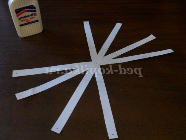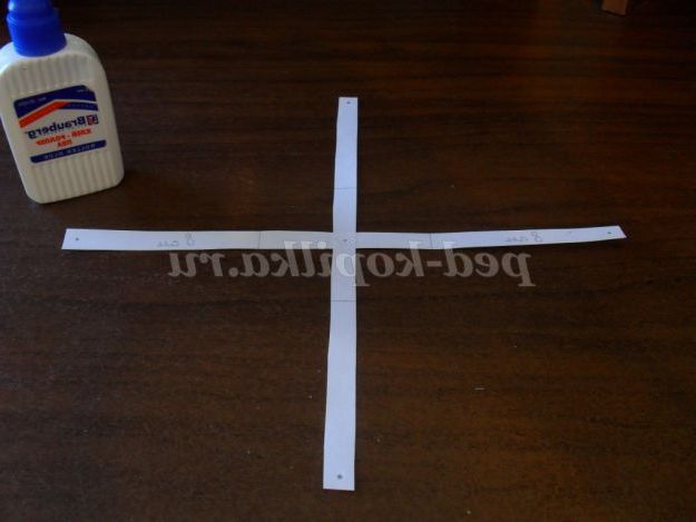 Далі беремо короткі смужки і знаходимо на них центр (8см), відзначаємо його точкою. Таким же чином склеюємо всі 3 смужки, поєднуючи їх центри.