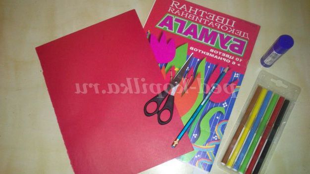 Кольоровий папір червоного кольору, кольорова декоративна папір, клей, олівець, ножиці, фломастери