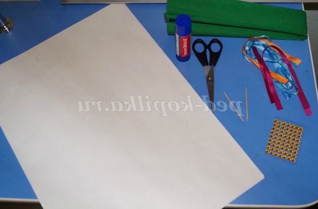 Білий аркуш формату А3,гофрований папір зеленого кольору, атласні стрічки (блакитна, помаранчева, червона),стрази, пара зубочисток, ножиці, клей.