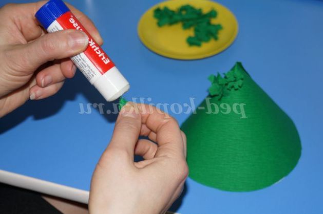Змащуємо кінець отриманих зелених бутончиків клеєм і наклеюємо на нашу основу-конус