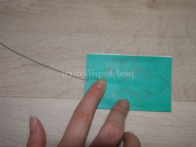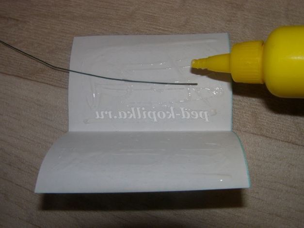 Змащуємо клеєм внутрішню сторону складеного аркуша,кладемо дріт. Після чого можна покласти листок під прес.
