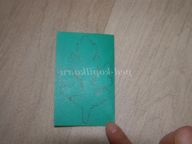 За шаблоном обводимо листочок по лицьовій стороні зеленого аркуша паперу, склавши аркуш вдвічі за розміром листочка. Поки не вирізаємо листочок.
