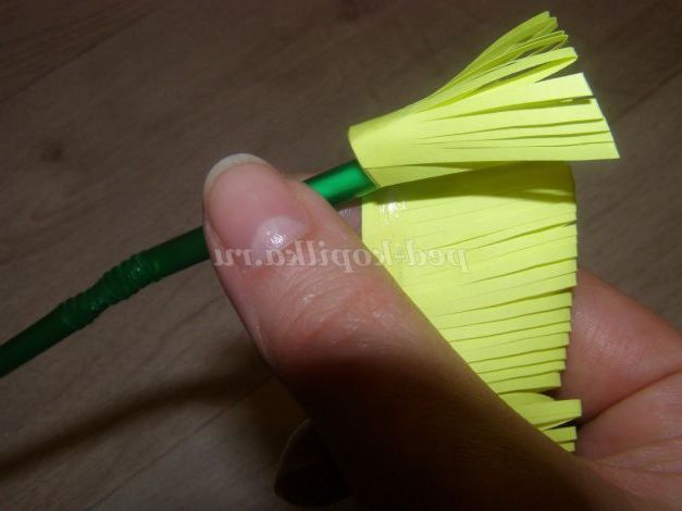 Тепер наносимо клей на край смужки і акуратно починаємо її намотувати на стеблинку (трубочкою)
