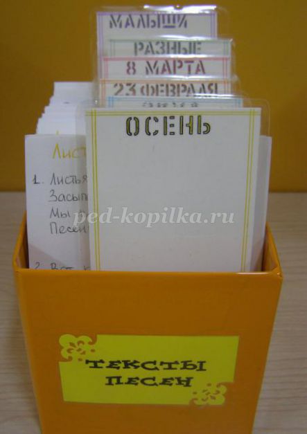 Текстів пісень назбиралося багато, так вийшла ціла картотека сезонно (осінь, зима, весна, літо...). Щорічно картотека поповнюється завдяки новому пісенного репертуару.